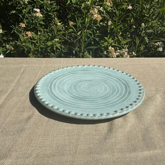 The pieces are thrown on the wheel using stoneware clay and hand decorated with coloured slips and glazes. They are oven and dishwasher safe.